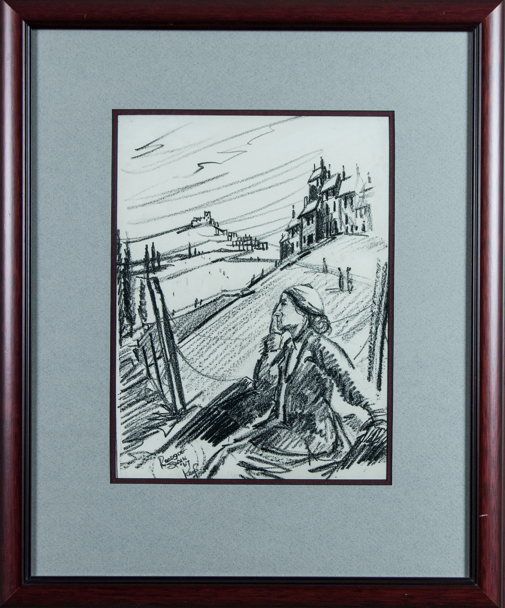- Description Crayon drawing of a landscape in Spain and a woman looking out at the landscape. One of 800 on-the-spot sketches completed by Keys during a 9-month, 10,000 mile European driving tour.