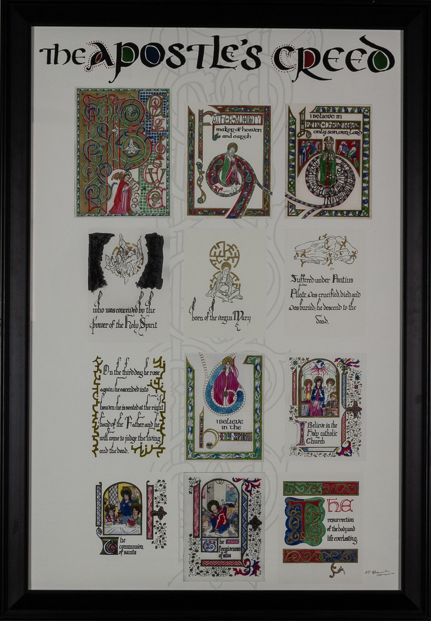 - Description Digital print of the series of original miniatures created for The Apostles Creed Chapel series in 2013-2014. The original miniatures were created with Bristol paper, ink, and gold ink. Charlton referenced "The Book of Kells", the Gothic Bastarda script, and local artist Harold Balazs in the series.
