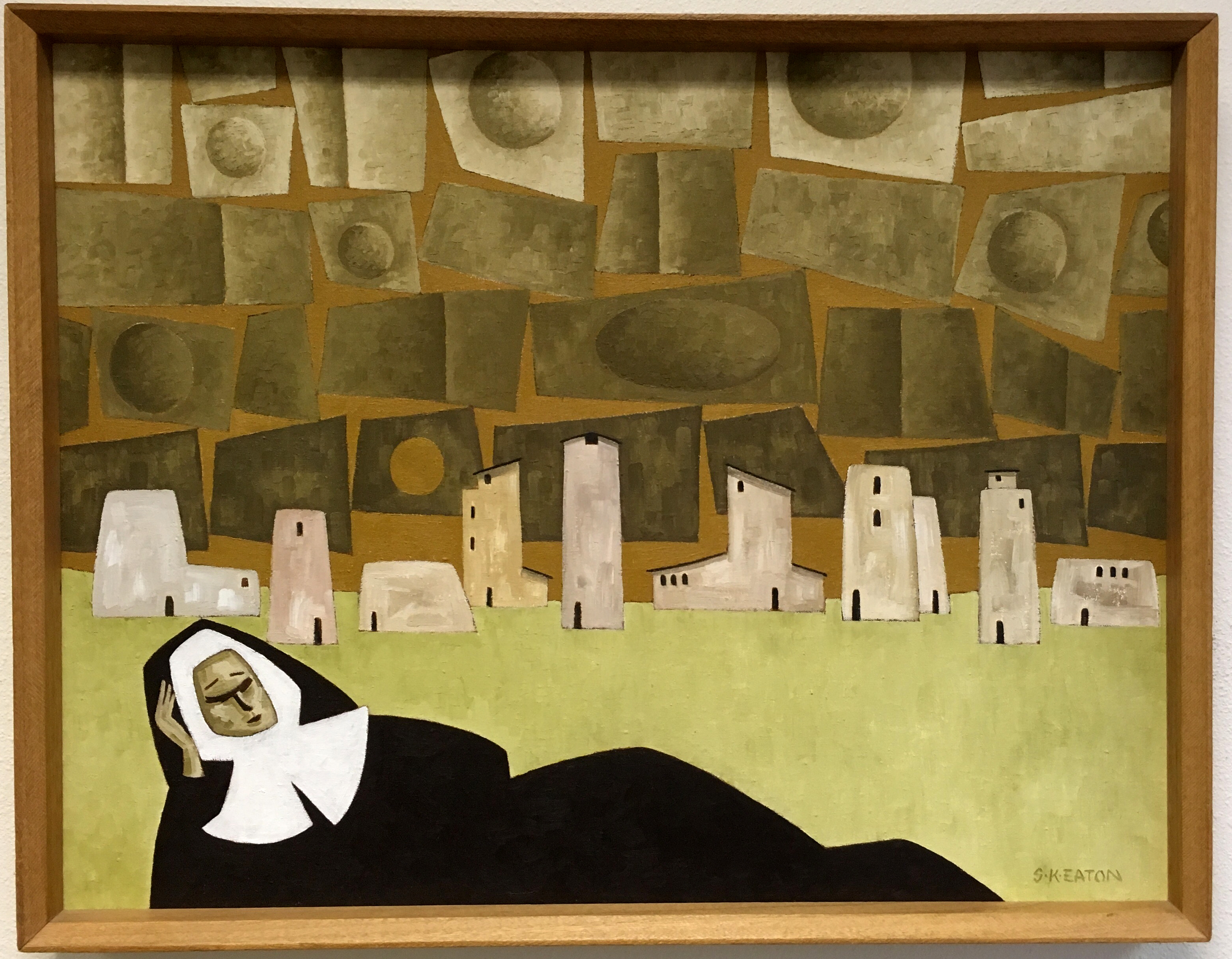 - Notes Sydney K. Eaton (1919-1996) dabbled in various art forms, from painting to sculpture to printmaking. Eaton was born in Bellingham, Washington. He earned a Bachelor of Arts from Whitworth University in1941 and is notorious for being one of the pranksters behind the “Whitworth Rock Hoax.” This title refers to the discovery of a curiously inscribed rock in the excavations for the foundations of the Jay P. Graves Gymnasium. Written on the rock was the date 1703 and inscriptions that generated great attention which in turn generated a plan to have the rock sent to the Smithsonian. As attention to this potentially history changing rock grew, Sydney Eaton and two other students came forward to confess what they had done. After his time at Whitworth, Eaton was stationed in the North and South Pacific islands during World War 2 as the military believed his music experience would make him adept with foreign languages and communication. During his time on these islands, particularly on Papua New Guinea, he became interested in indigenous art. Back in Washington State in 1955, Eaton earned his Master of Arts degree from Washington State University only a year after he founded the art department at Skagit Valley College. Eaton uses the reoccurring figure of the nun in his paintings such as Whitworth Collection’s The Prophesy of St. Trinoletta, where these women are often posed in unexpected leisurely or thoughtful poses.
