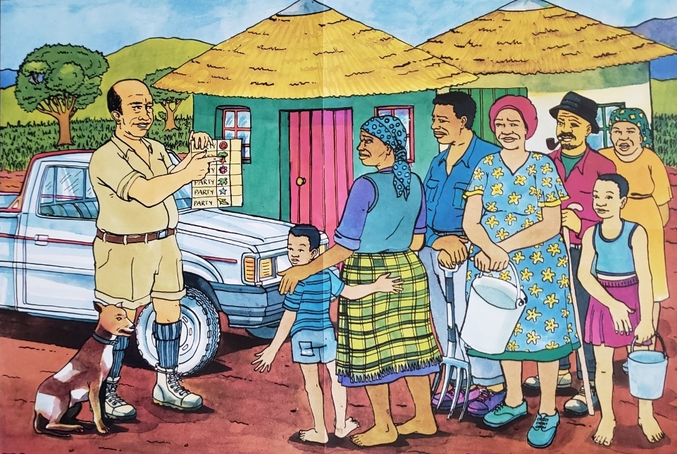 - Notes IDASA (Institute for a Democratic Alternative for South Africa) commissioned Israel Mashigo to produce ten large color posters dealing with the most critical electoral issues in 1993. The printed posters along with a training manual were placed in a “You Can Vote” kit to be used by people leading voter education workshops in rural areas all over South Africa. This poster is intended to begin a conversation about what people should expect during a campaign. The workshop leader was instructed to emphasize the fact that all parties have a right to campaign, but that no one can obligate any individual to vote for their party. Workshop participants were encouraged to talk about how candidates should persuade voters and the importance of each person deciding for themselves how to cast their ballot.