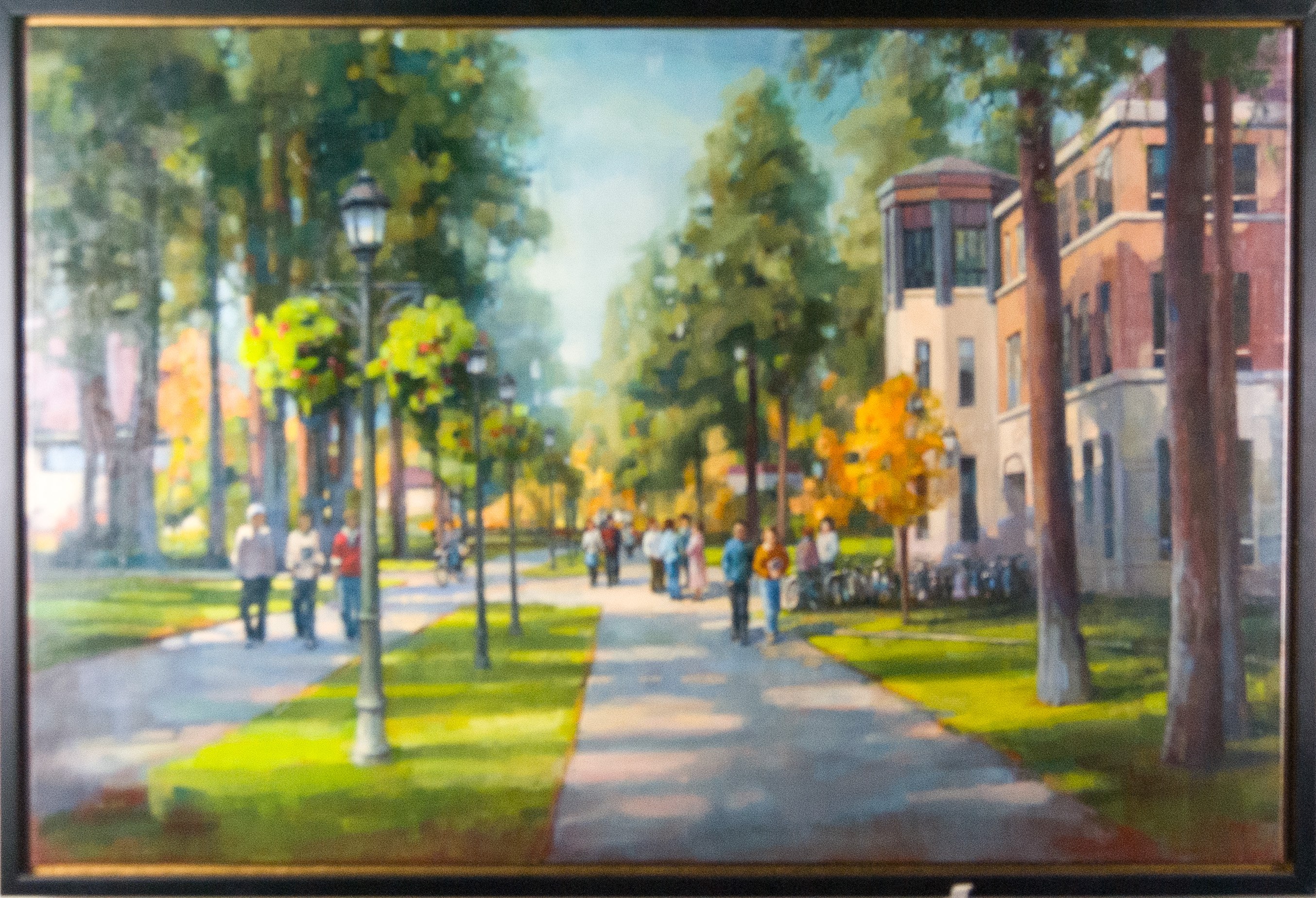- Description Original painting of the Hello Walk on the Whitworth campus, featuring students and Dr. Karin Heller in a pink dress.